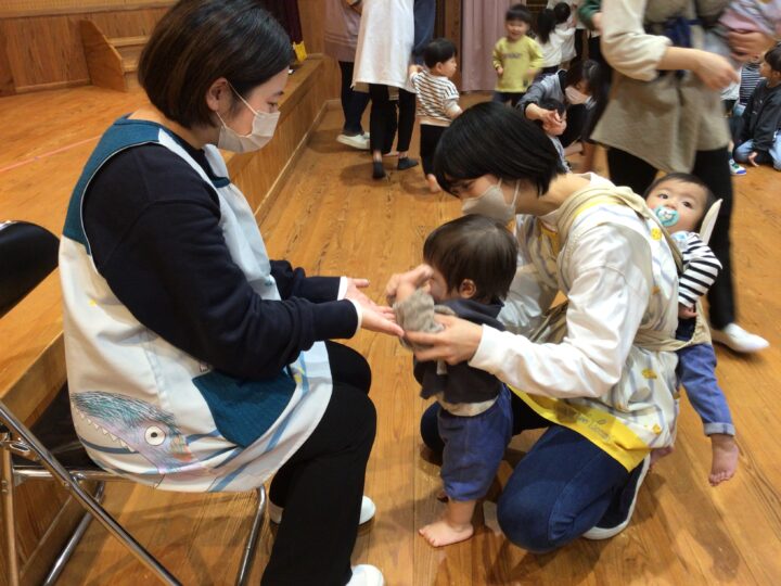 お遊戯室では、「けんけんぱ!」をチャレンジ中!リズムよく足をひらいたり閉じたりってなかなか難しいですよね・・・。