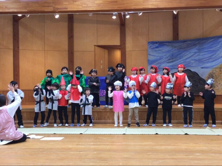 保育教諭の寸劇を見ながら、プールでのお約束を確認しました。