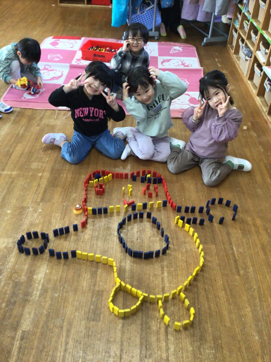 ドミノ倒しで遊んでいたお友だち。何かの形ができあがっていく様子に周りのお友だちも興味津々✨