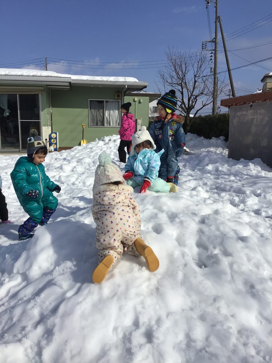 今日は雪遊びをしました!すっかり雪に慣れた様子の子どもたち!バランスをとりながらずんずん歩いて、沢山んお散歩をしていましたよ!雪だるまを作っているお友だちも!