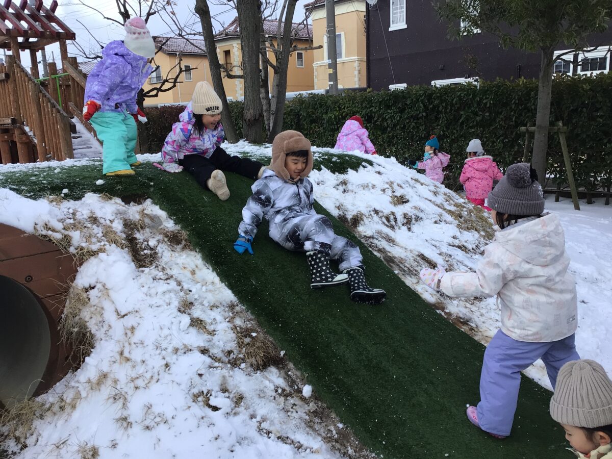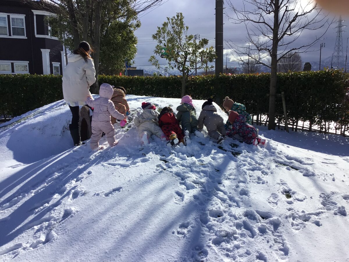 築山を滑ったり、雪の上をゴロゴロしてみたり、思い切り雪遊びを楽しんでいたうさぎ組さん😊