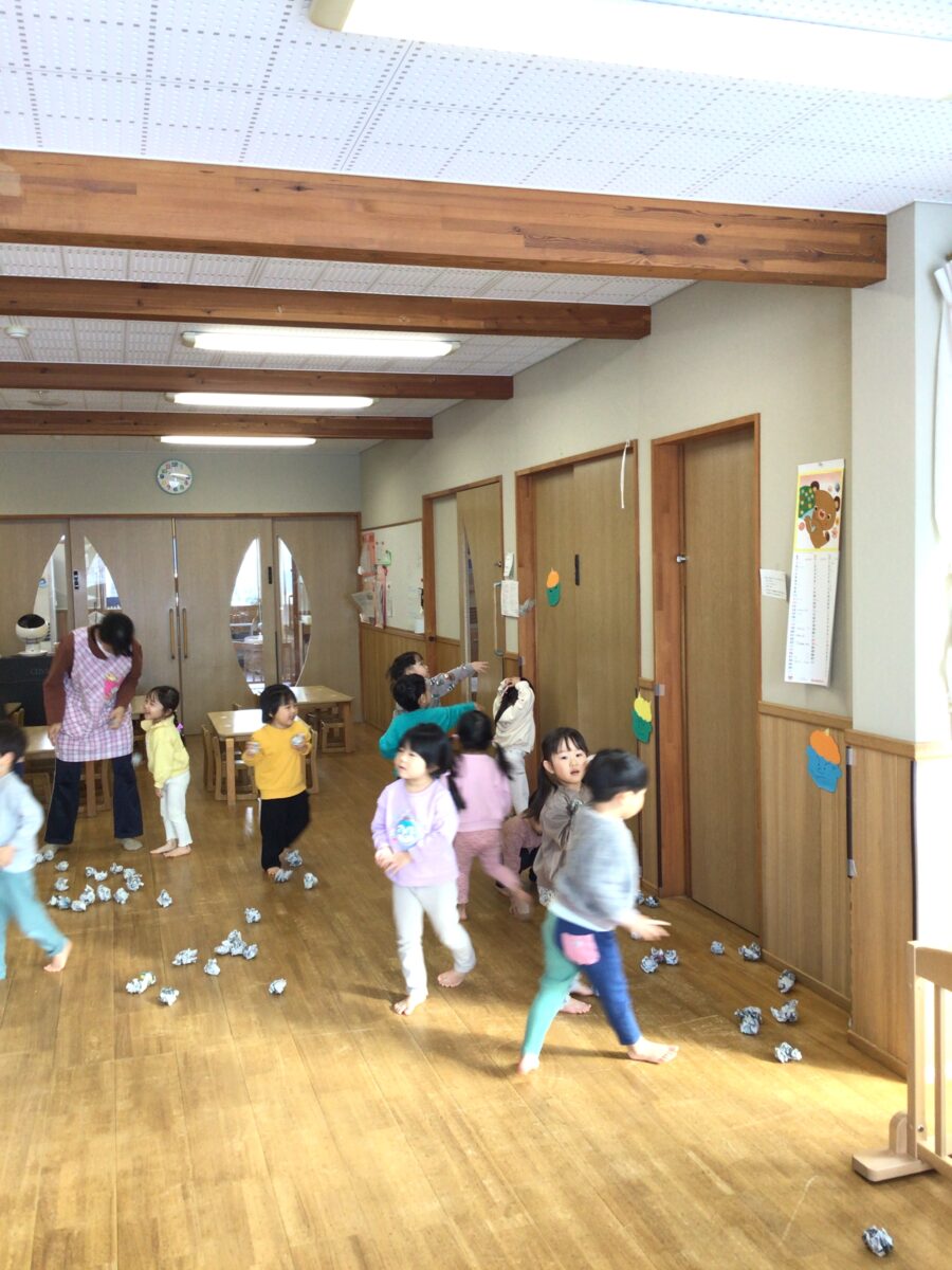 みんなで作った新聞紙の豆を使って「オニ退治」「豆まき」の練習をしました。