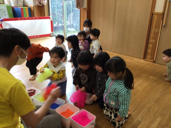 お友だちとの関わりが楽しくて誘い合ったり、やりとりを楽しむ姿が見られています。