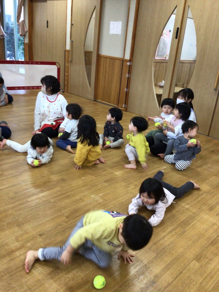 ボールのお約束をした後、一人一つずつボールをもらって「コロコロコロ…」と転がしたり、小見先生の「○○してみよう!」を聞いて動作を楽しみました。