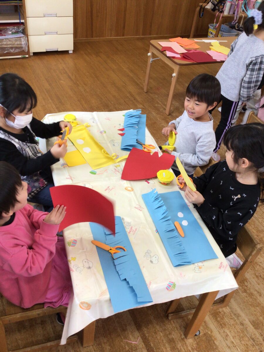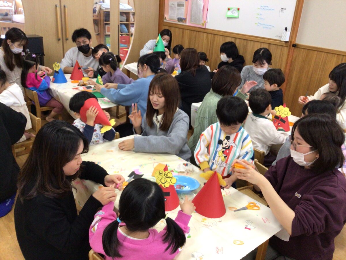 もうすぐ「節分」。お家の方と一緒にオニの帽子の制作を楽しみました。