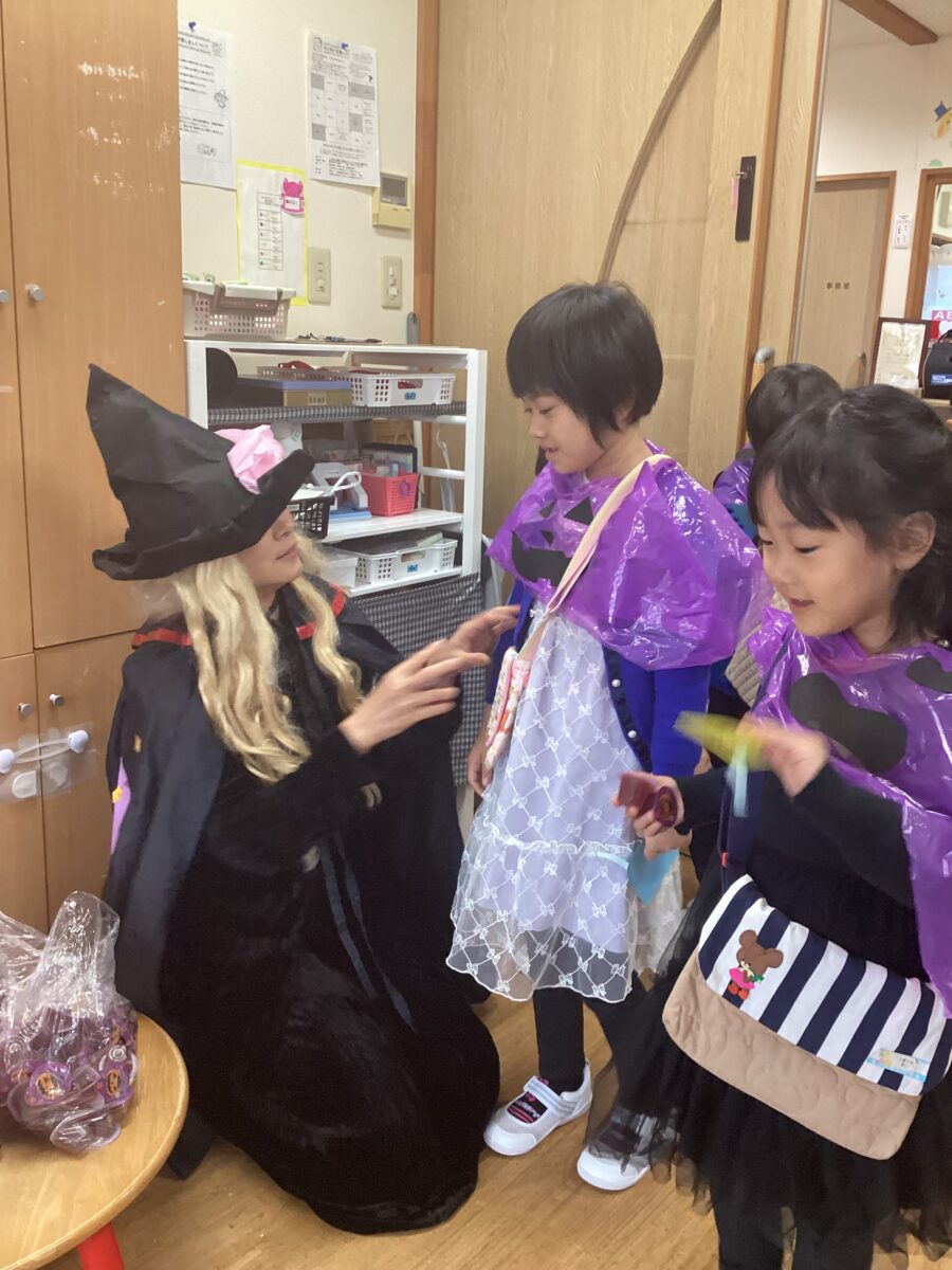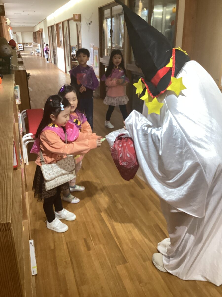 トリックオアトリートごっこでは、魔女やおばけ、ジーニーなどに仮想している先生におかしをもらい嬉しそうにしていた子どもたち。