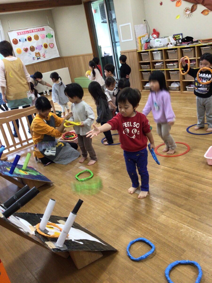 ハロウィンコーナー遊びでは、輪投げやボウリング、ぬり絵、かぼちゃ積みのコーナーがあり、それぞれ好きな遊びを楽しんでいました😊