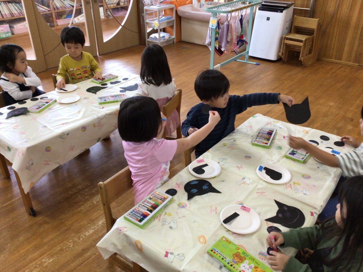 今日はハロウィンの製作をしました。1人ひとり、「かわいいかおにしようかな・・・」