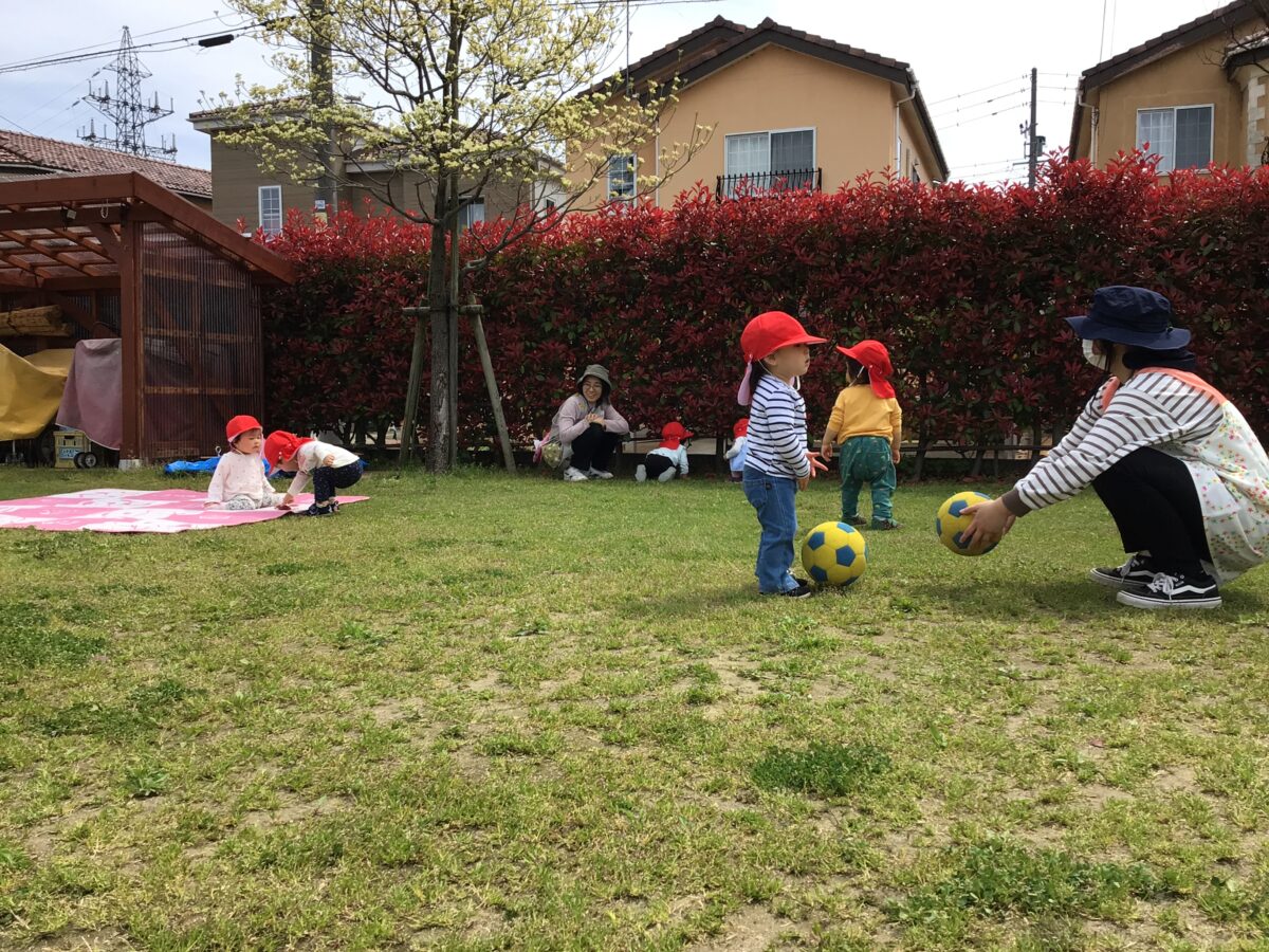 汗ばむくらいの陽気の園庭で、芝の上でゆったりしたり、ボールを追いかけたり、砂場で遊んだり・・・