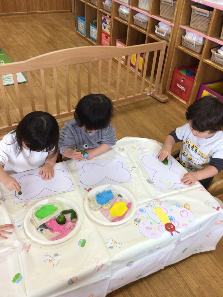 今日は、野菜スタンプでちょうちょの羽に模様をつけました!