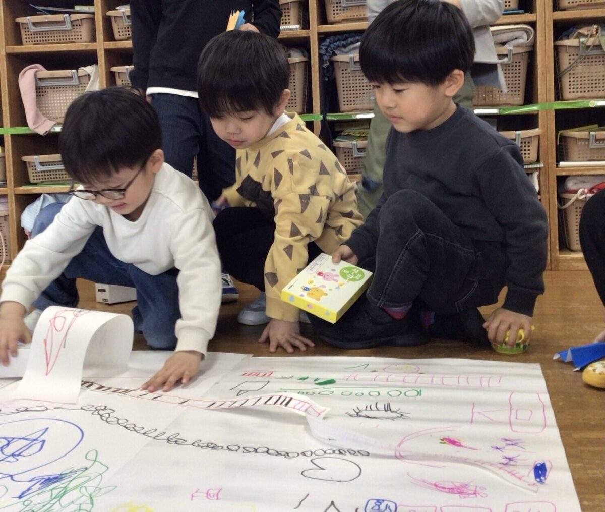 大きな紙に町を描いていた子どもたち。