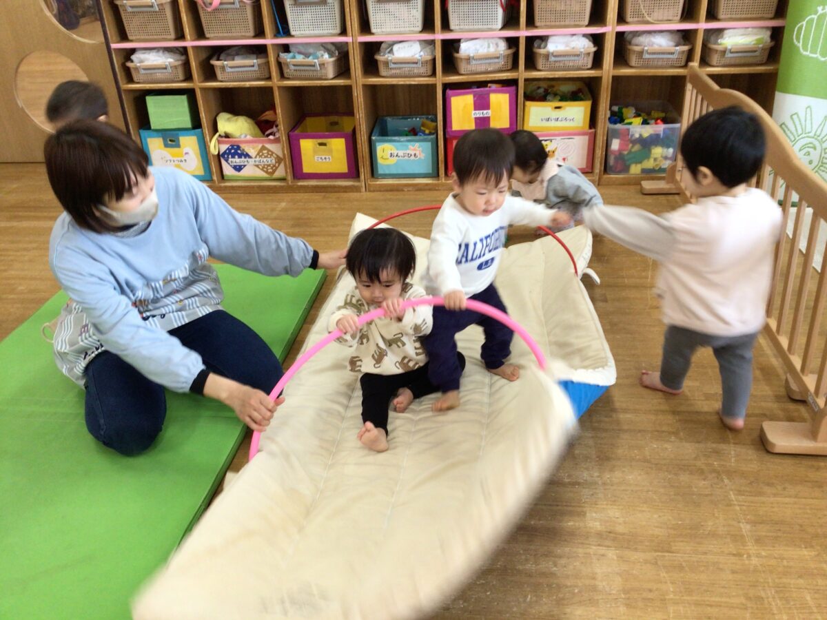 フープを揺らすとゆらゆらと動くトンネルに大興奮の子どもたち😊