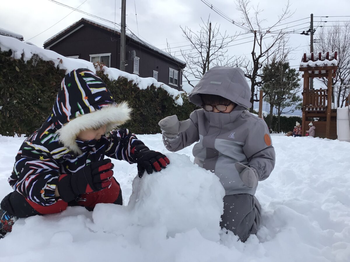 みんなで力を合わせて雪だるまを作っています⛄