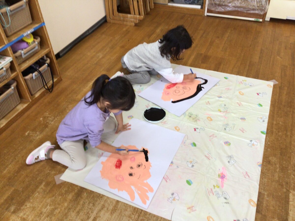 今日は、黒の絵の具を使い”髪の毛”を描きました。顔とは違い、下書きをせずに描きましたが、