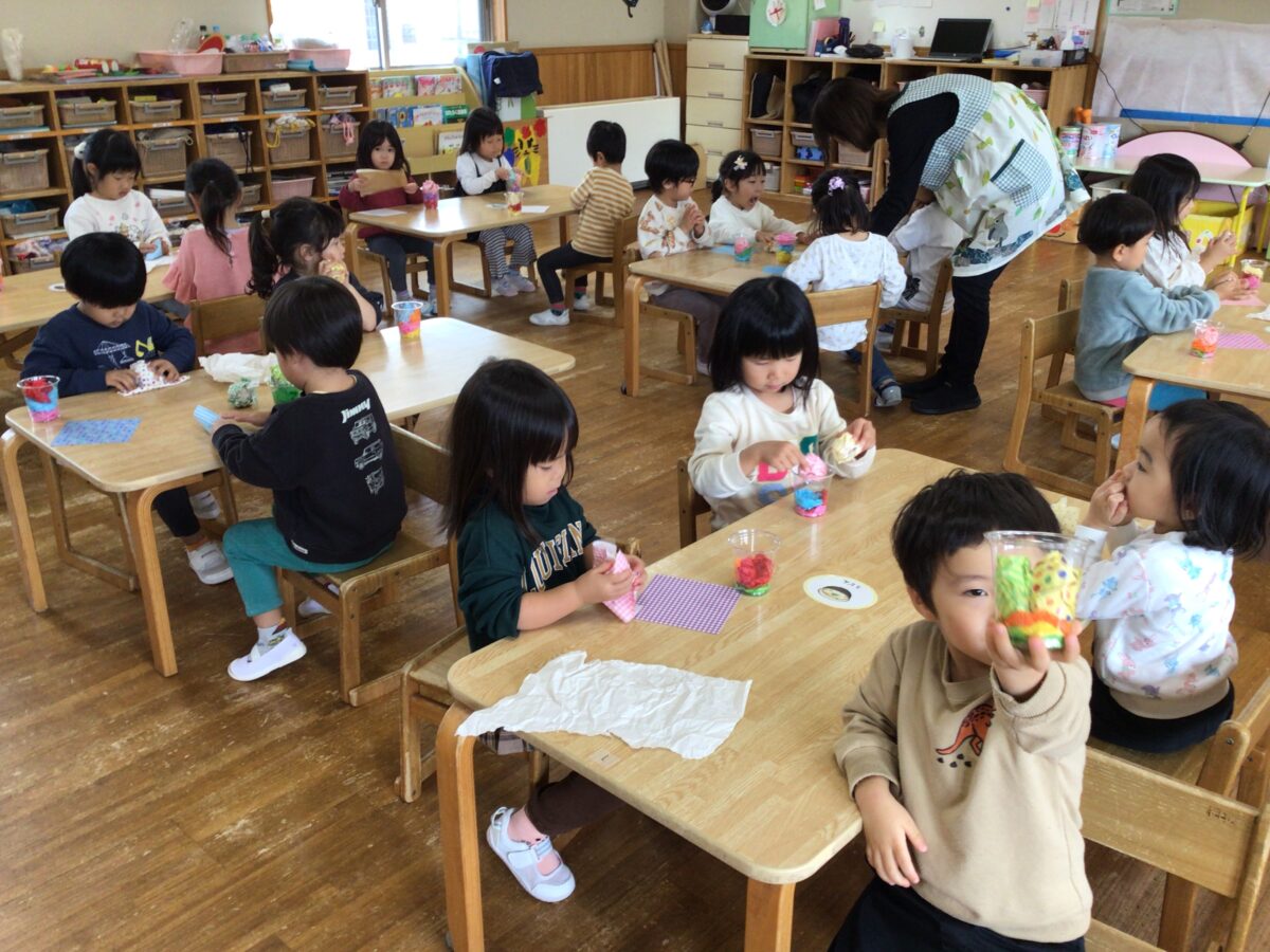 まだ、力加減が難しい子どもたちでしたが、握る力を加減しながらコップに入れました😉