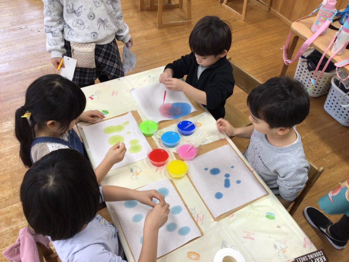 好きな色をポタポタっとたらして、染まる様子に「きれい~💗」とうっとりしていた子どもたちでした💗