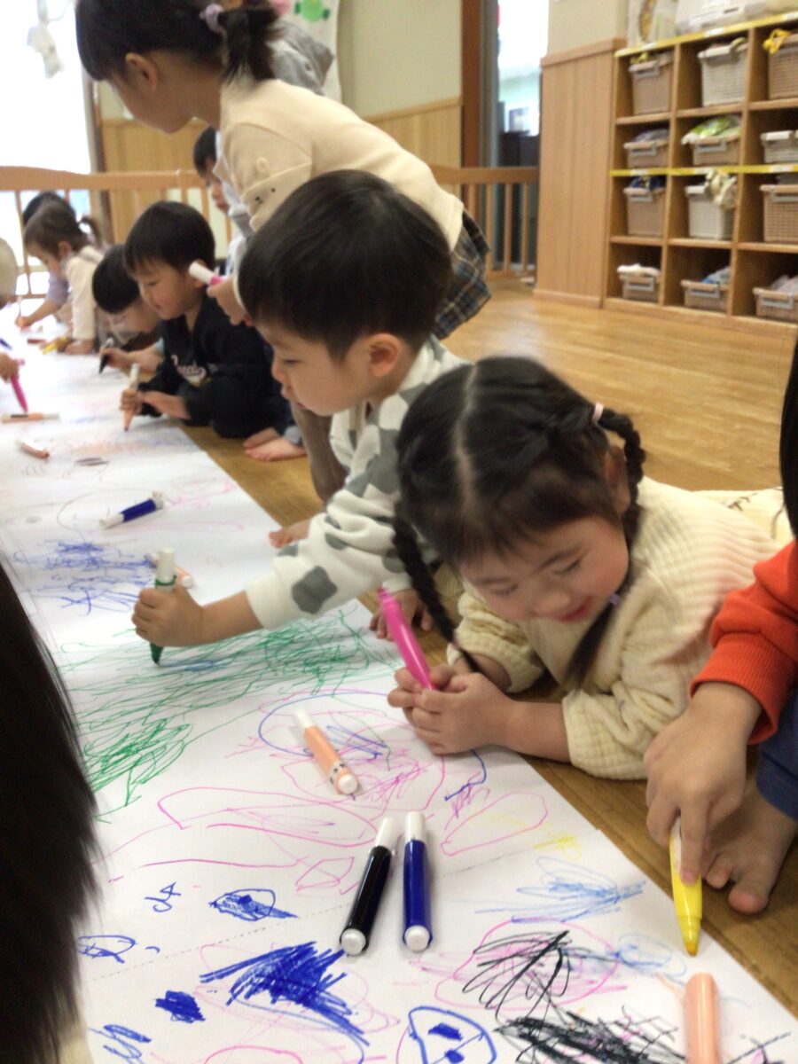 今日はお部屋で大きな紙に、みんなでお絵描きをしました!