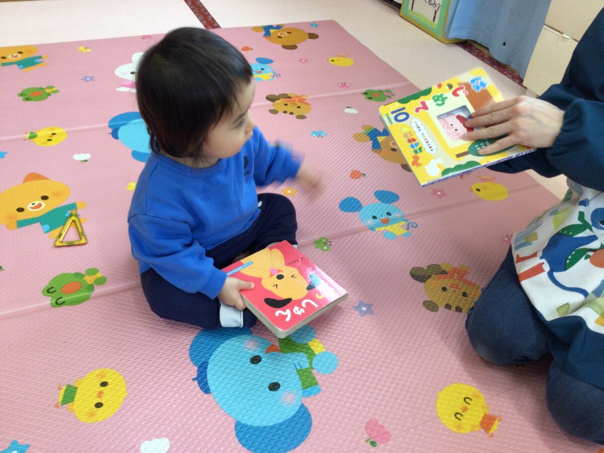 お気に入りの絵本を見つけると、保育者に『で~(よんで)!!』と