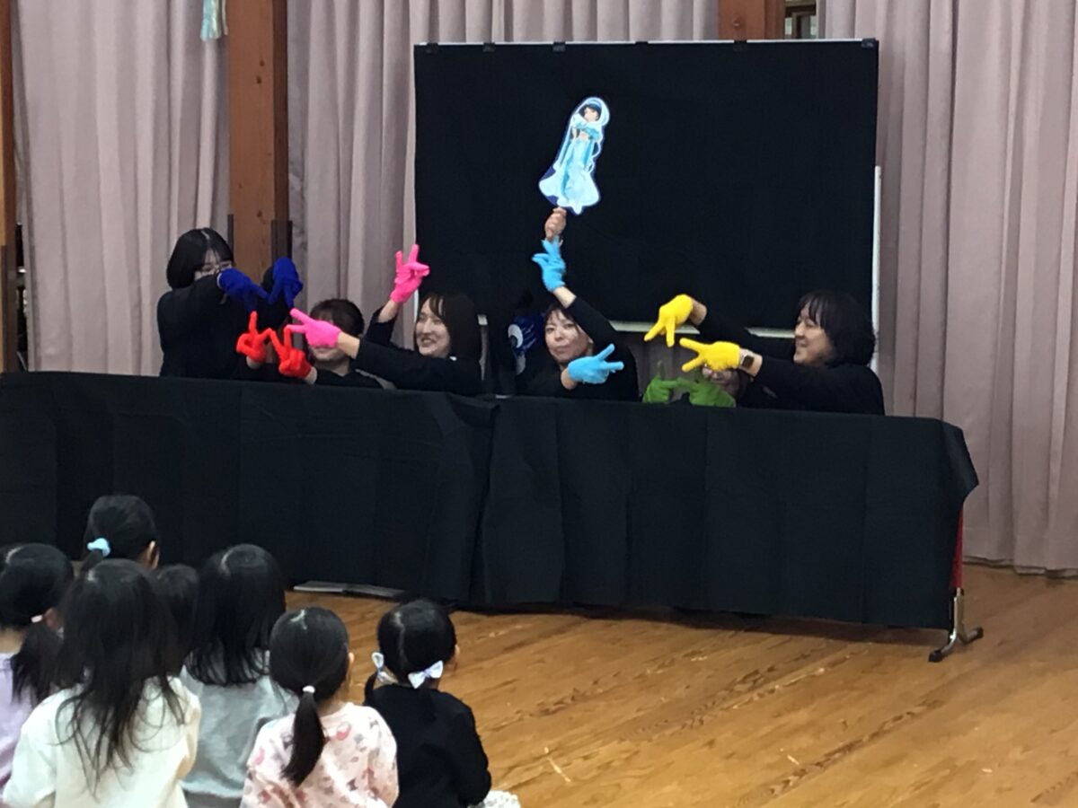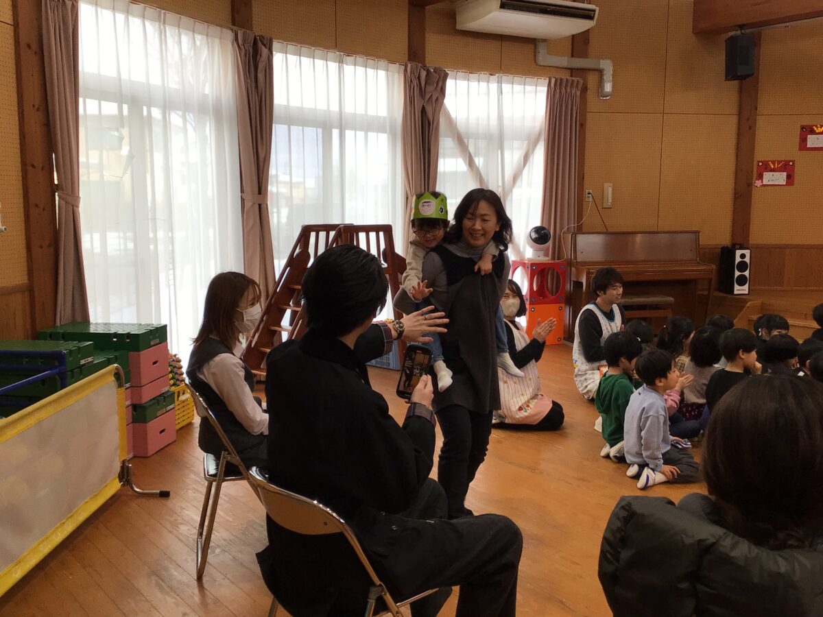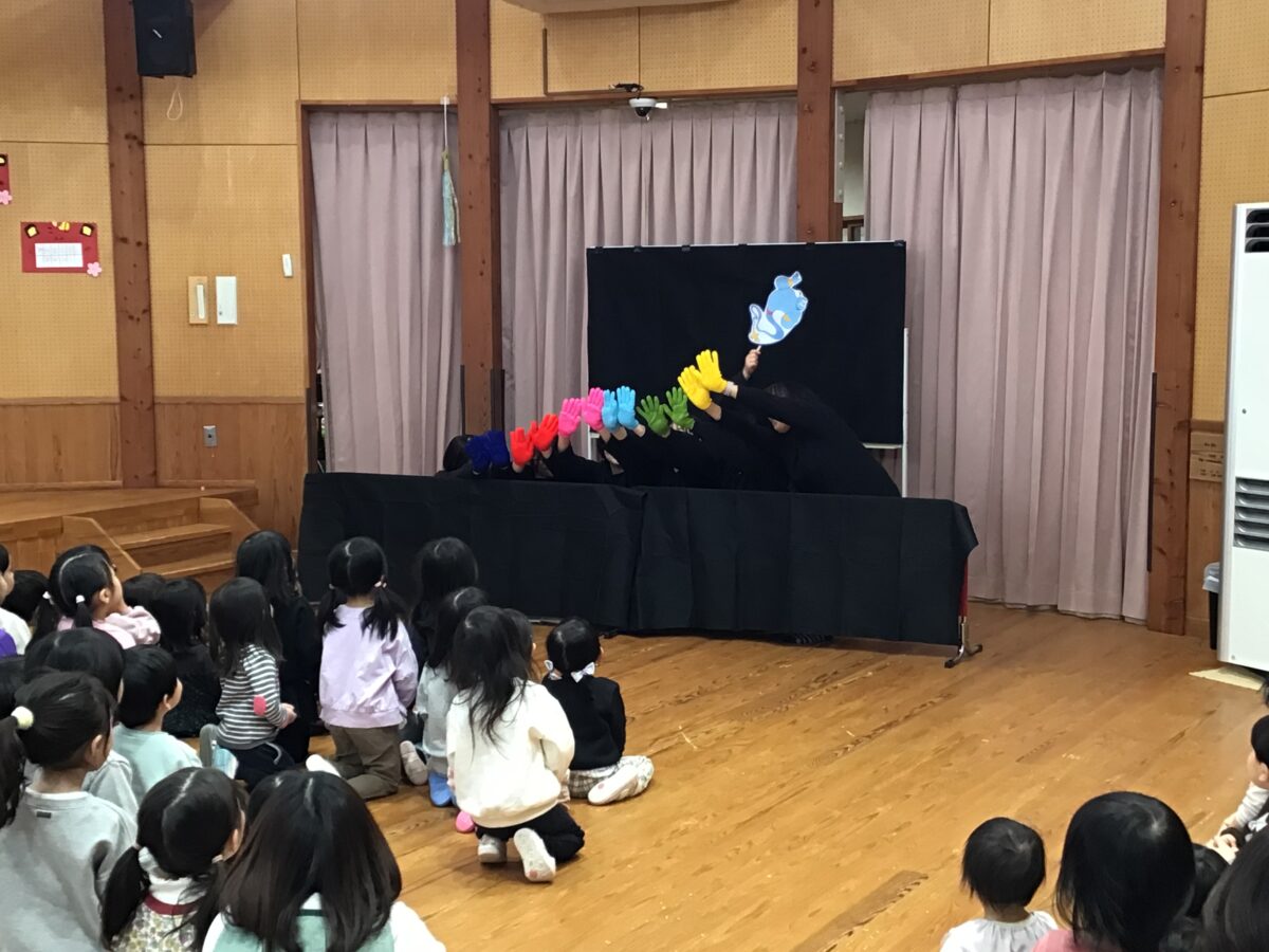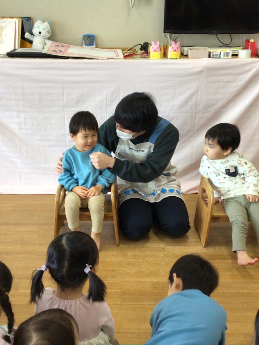 3、4、5歳児クラスのお友だちと0、1、2歳児クラスのお友だちに分かれて誕生会が開かれました!