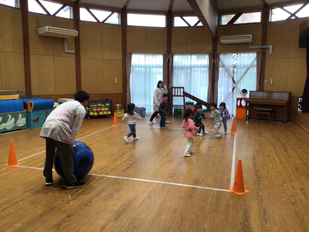 今日は転がしドッヂボールをしました!大きいボールに当たらないように逃げ回るうさぎ組さん!