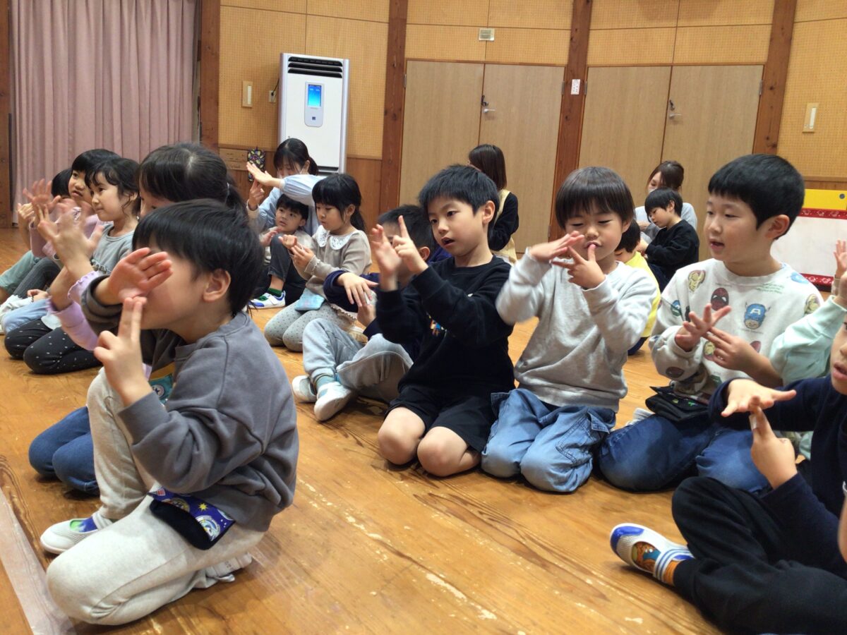 英語のレッスンがありました。グーチョキパーでなにつくろうの英語の歌に合わせて、手で形を作っています。「難しいなぁ~」「こんな形ができたよ!」と嬉しそうにお友だちと形を作る姿が見られました!
