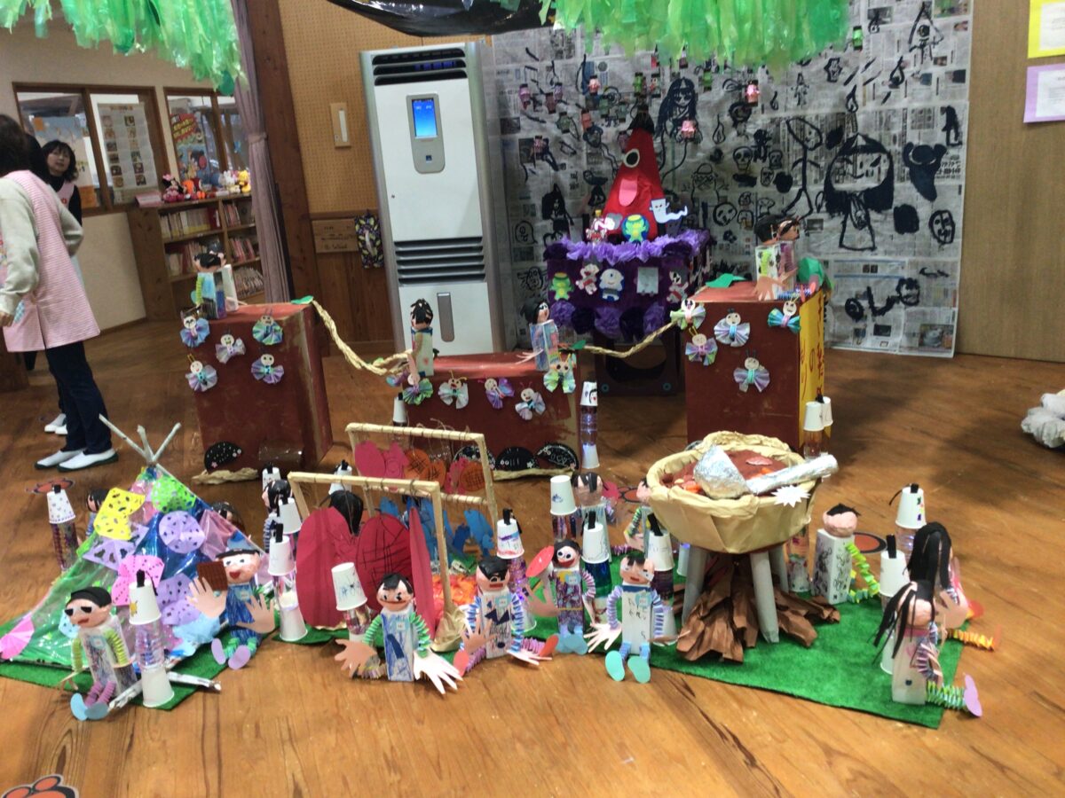 子どもたちは、自分で作った作品を「こっちだよ」「みてみて」と