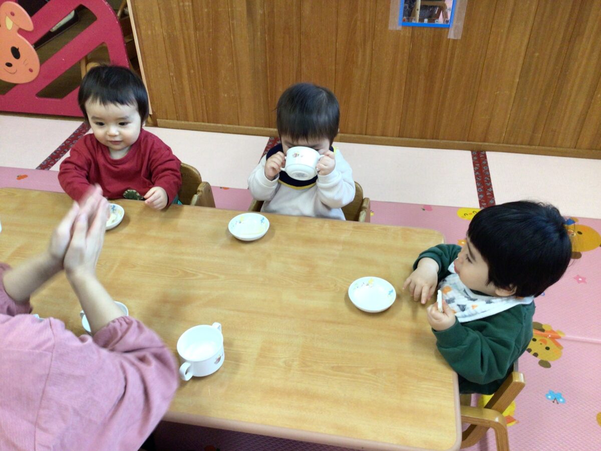 自分でコップをもちゴクゴク♪ おいしくてにっこり笑顔☺