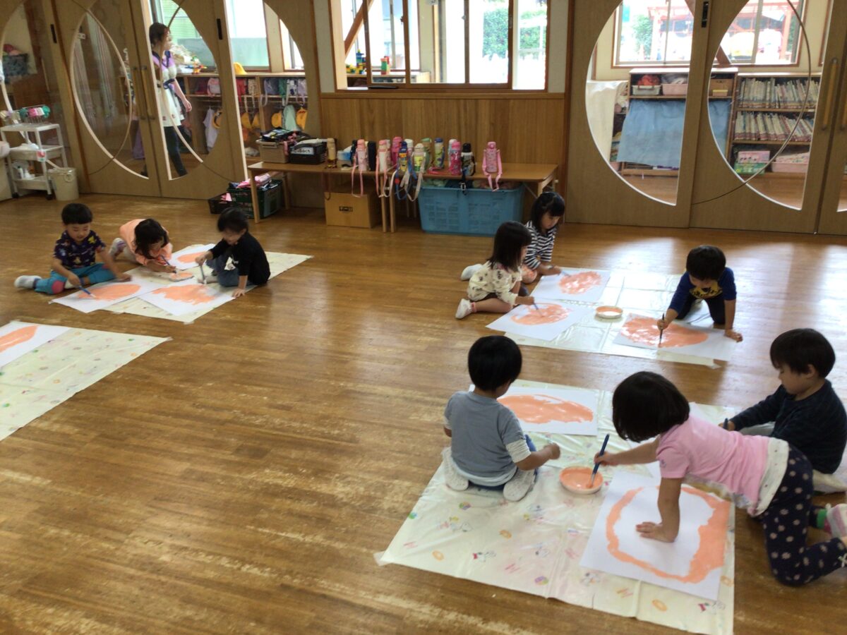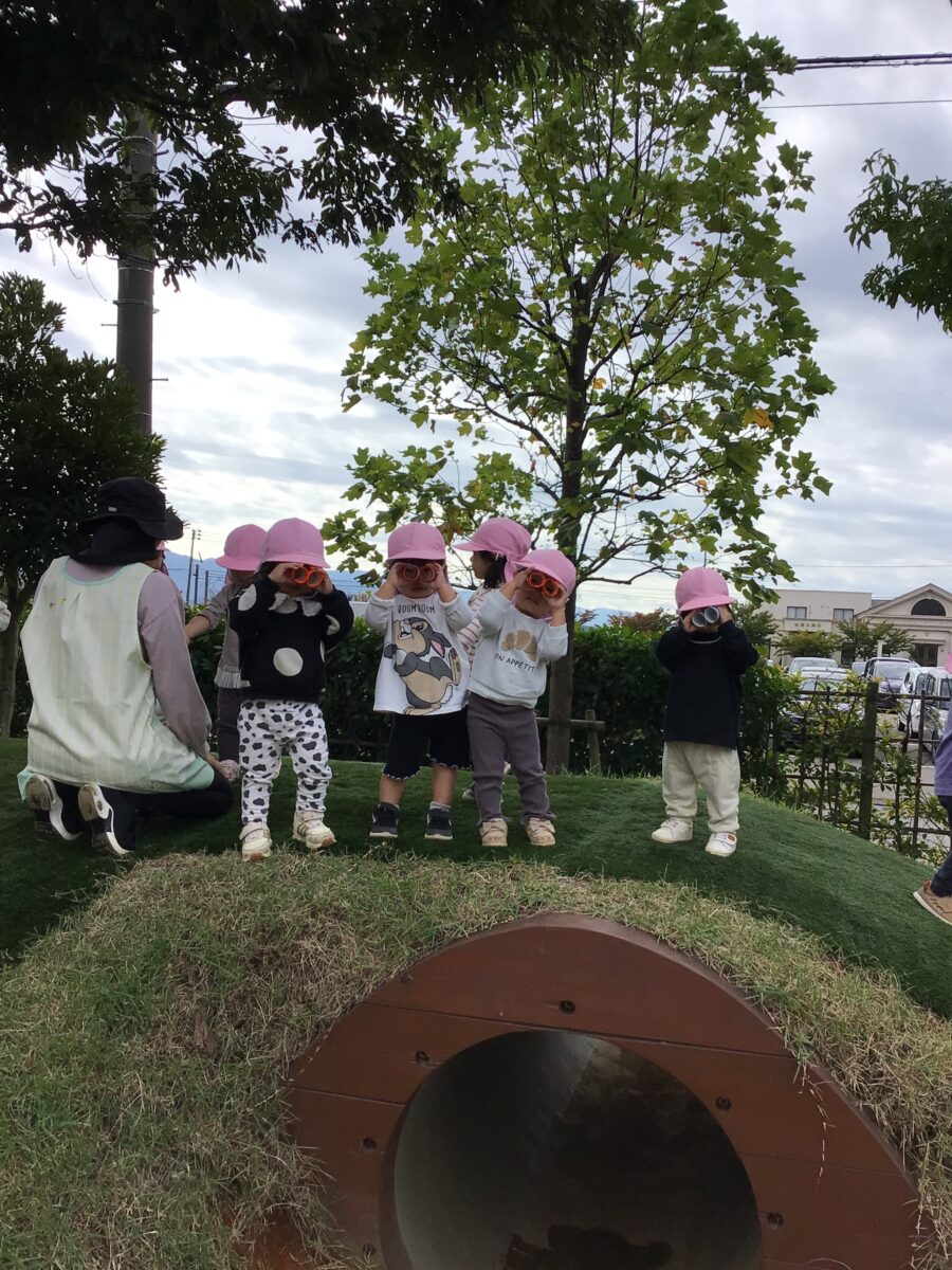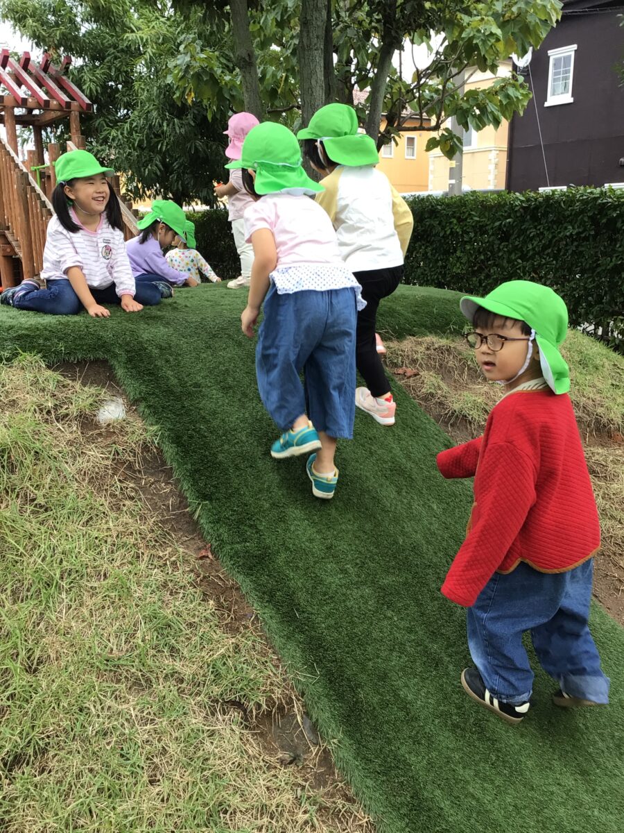 今日は園庭に出て遊びました。木の実、どんぐり探しをしているお友だちや鬼ごっこをしているお友だちがいました。築山では人工芝の坂を滑り台に見立てて「あ~れ~」と滑ってお友だちを楽しんでいましたよ♪