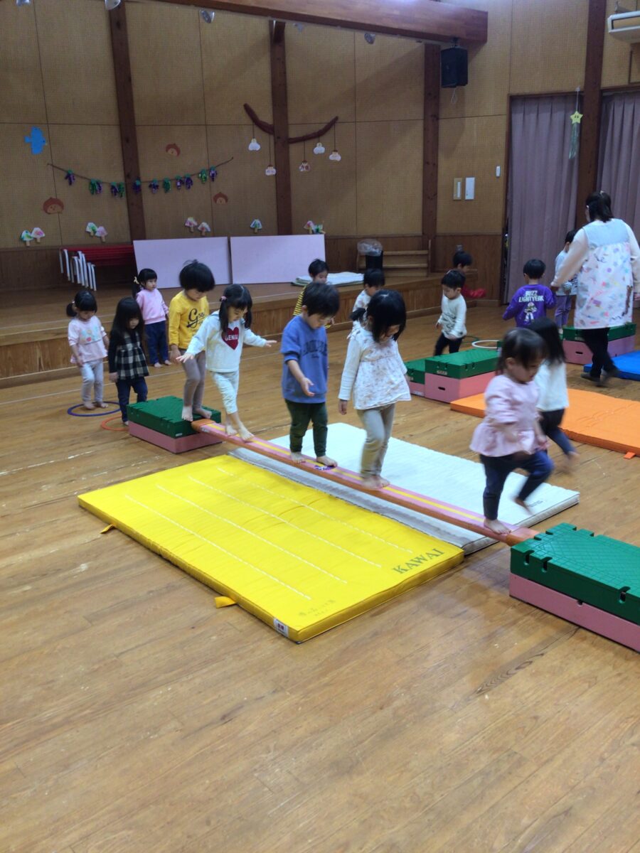 今日はお遊戯室で遊びました。一本橋から落ちないように…両手を広げてバランスをとっている子や巧技台から「せーの!」でジャンプする子、「みててね~!」と声をかけて滑り台を滑る子など、それぞれの遊びを楽しんでいたりす組さんでした😊