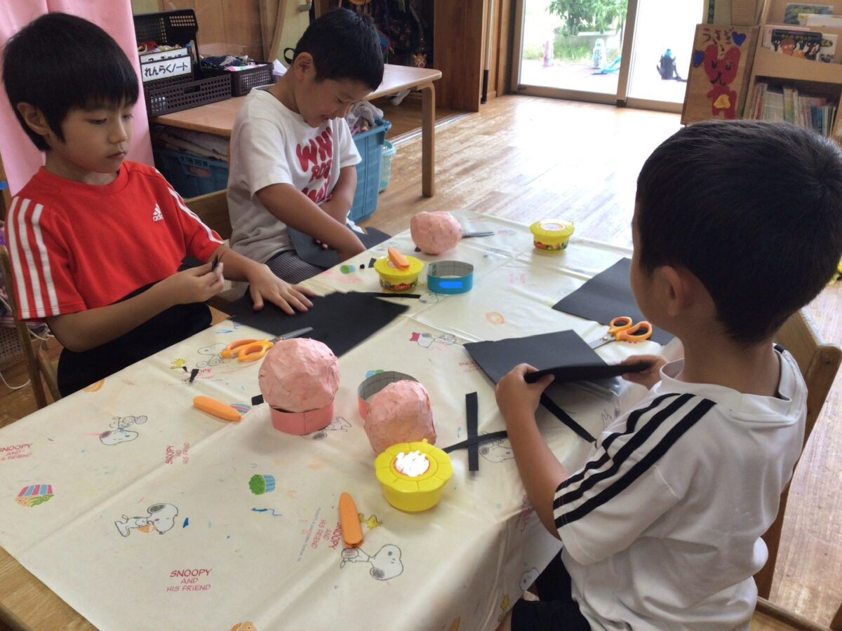 “自分の髪の毛はどうだっかな~”と思い出しながら…画用紙を切っていた子どもたちでした😆