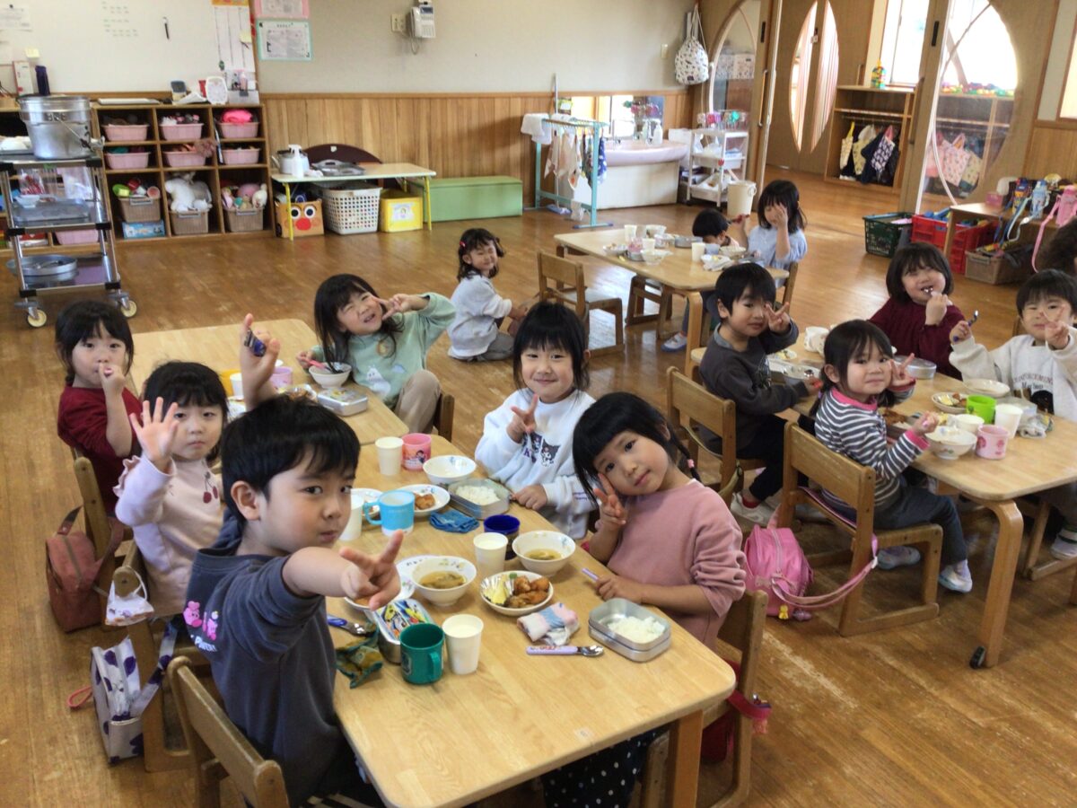 「一緒に座ろう~」「こっちあいてるよ😊」と声をかけ合いながら楽しそうに食べていたうさぎ組さんでした😊