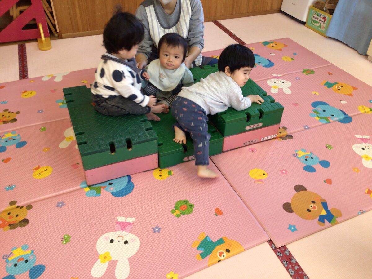 巧技台の階段では、ずりばいやハイハイで上まで登ると、お友だちと一緒に休憩しているお友だちがいましたよ😊