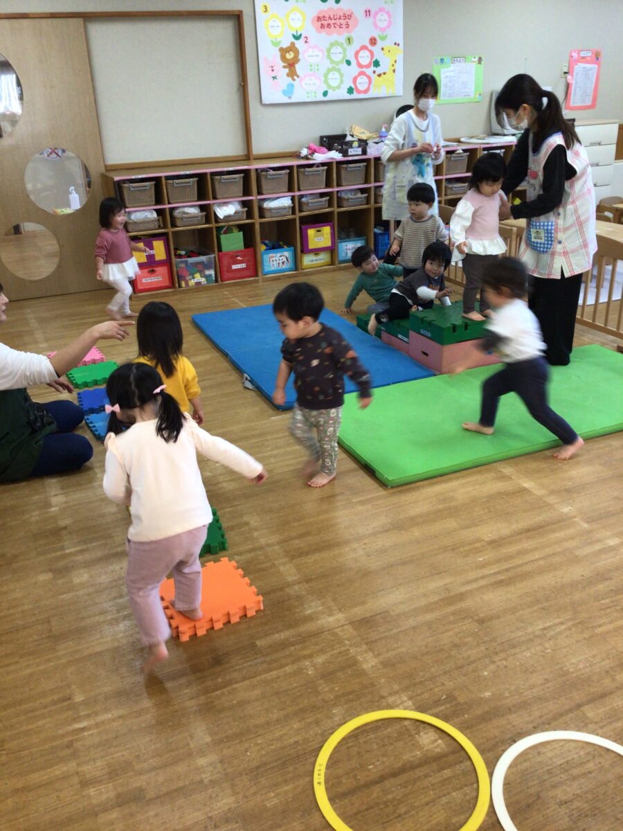 巧技台に登って元気よくジャンプをして遊んだり、音の鳴るマットの上を歩いてニコニコしたりなど自分の好きな遊びをたくさんしてご機嫌で過ごしていたことり組さんでした😊