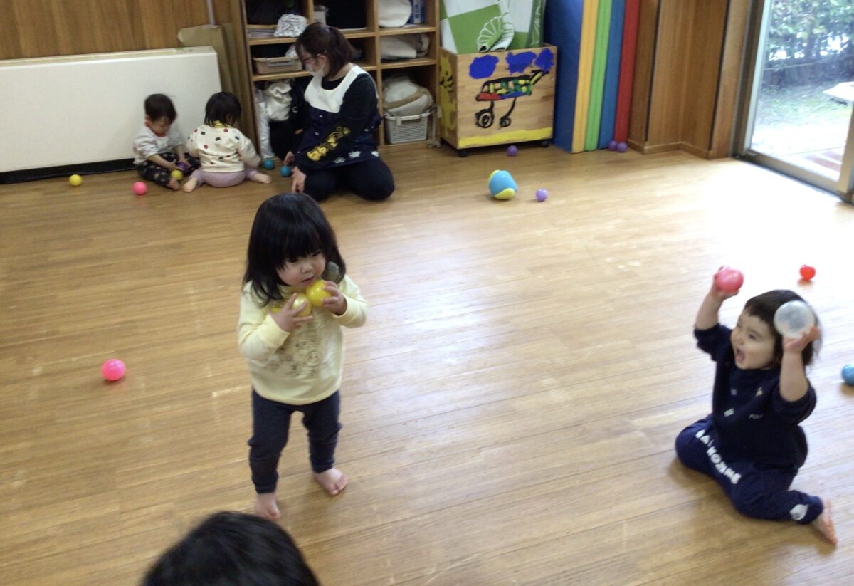 今日は、ボール遊びをしました!保育者と一緒に沢山ボールを集め、「3、2、1、、、ぽーん!」と
