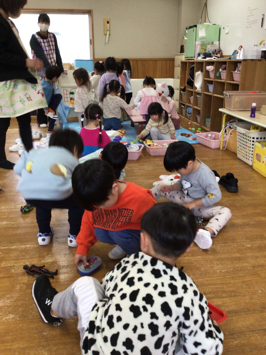 張り切って靴を履いてうさぎ組さんに向かいました。いつもと違うおもちゃがたくさんで、