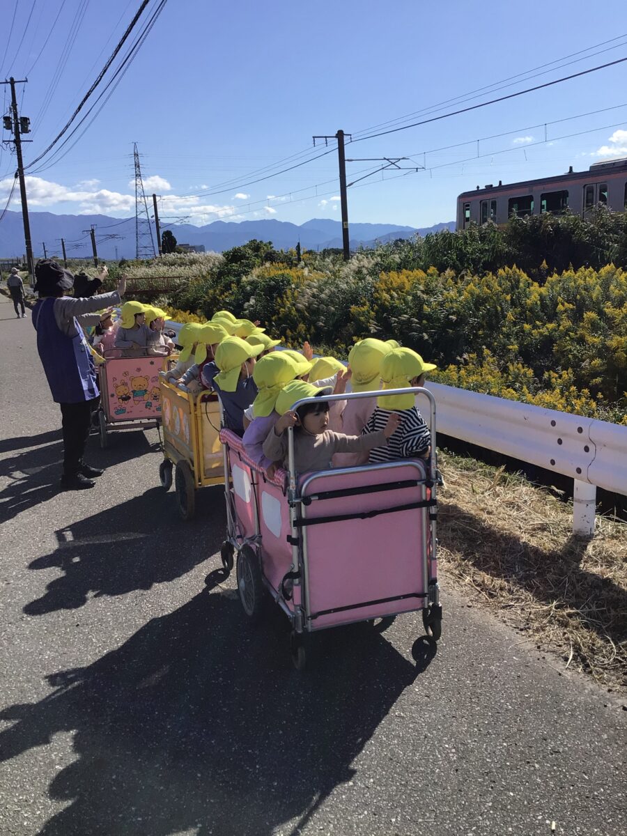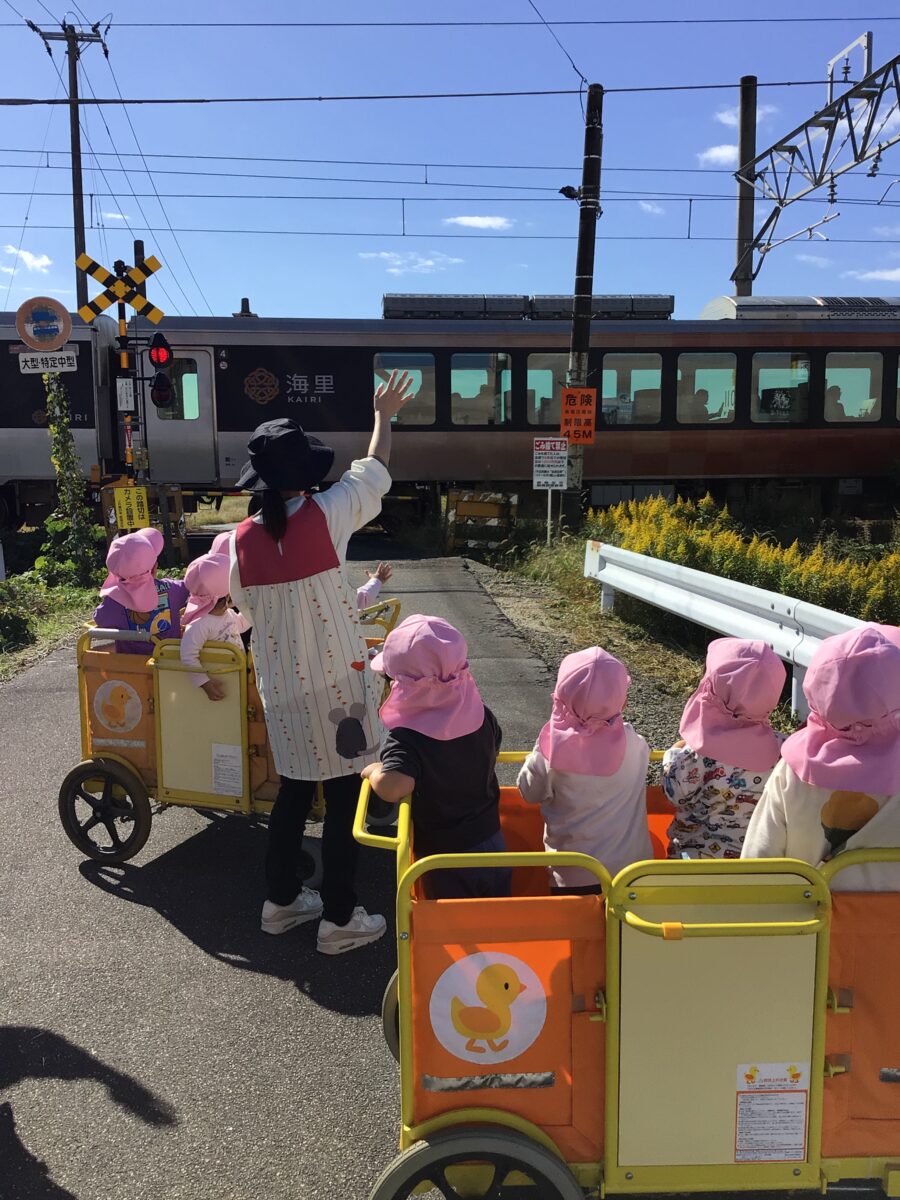 今日は散歩車に乗って西新発田駅の方までお散歩へ!電車や踏切が動いているところを近くで見ることができ、目をキラキラさせていた子どもたちです。「でんしゃいたねー!」「カンカンカン!」