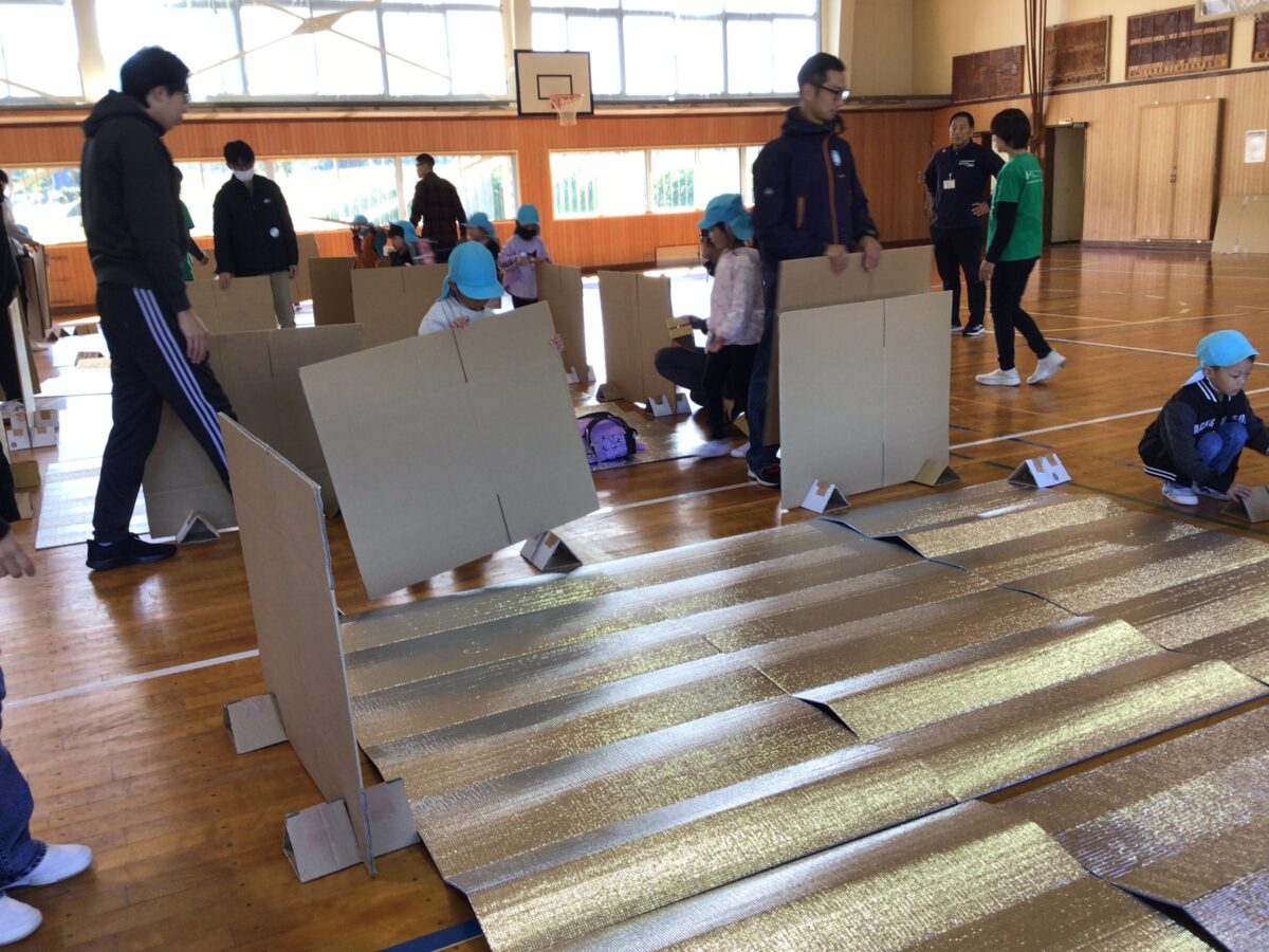 まずは、段ボールを使って避難スペースづくりをしました。「こっちは壁があるから、ここに置こう!」「こっちはガラスがあるから…」とどこに置くといいか考えながら設置していました。