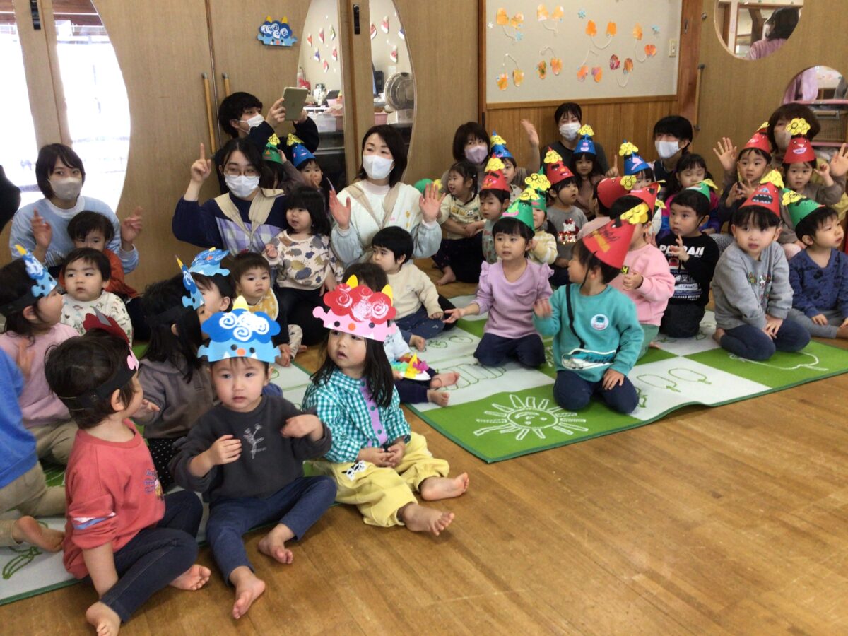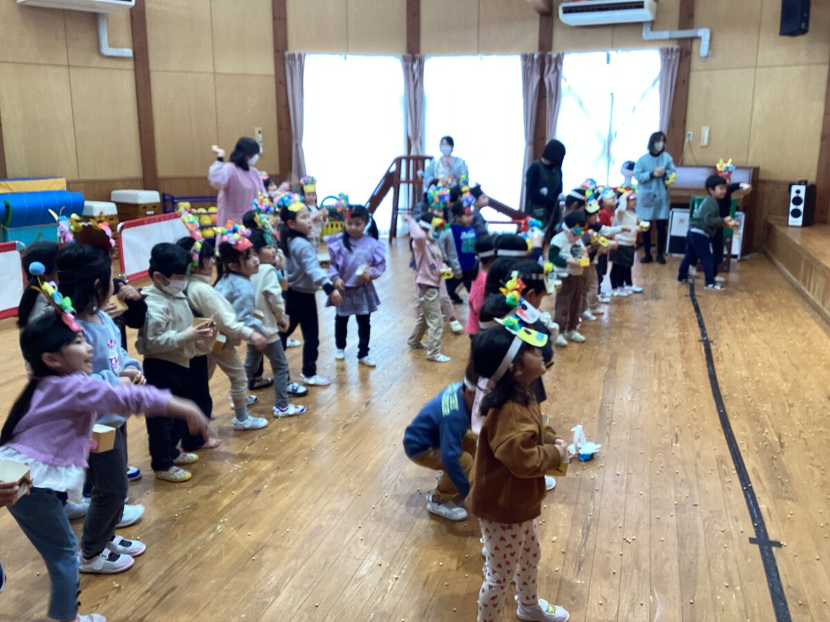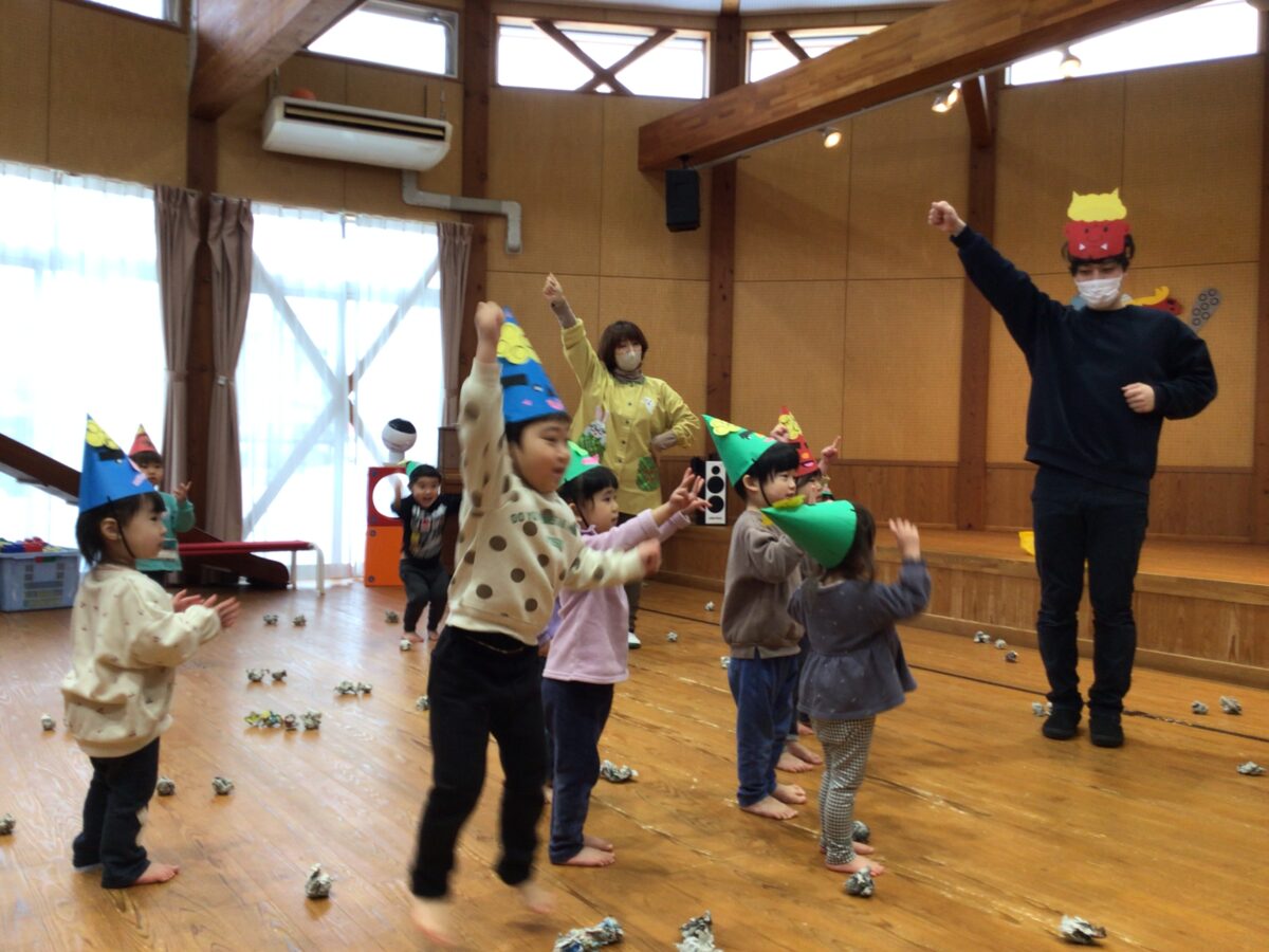 鬼に豆まきをした後は、鬼さんと仲良しになった子どもたち。みんなで一緒に『鬼のパンツ』の踊りを踊って、みんなニコニコ笑顔のまま、楽しく節分の会が終わりました😊