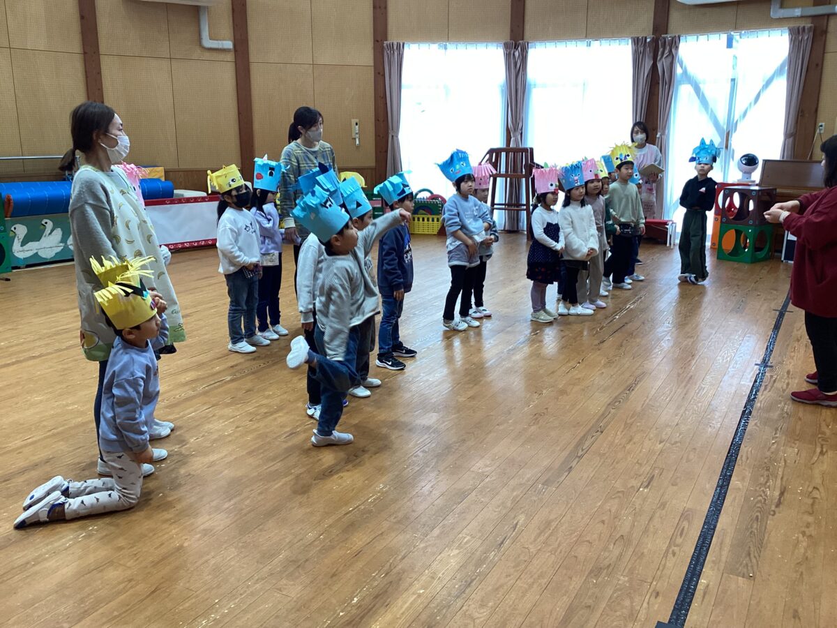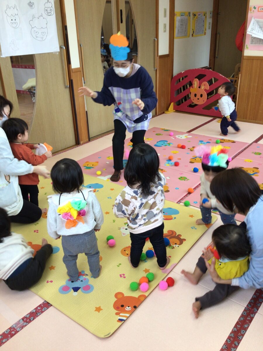 お部屋で集まって「節分ってどんな日かな?」というお話を聞いてから、各クラスに分かれて豆まきごっこを楽しみました。