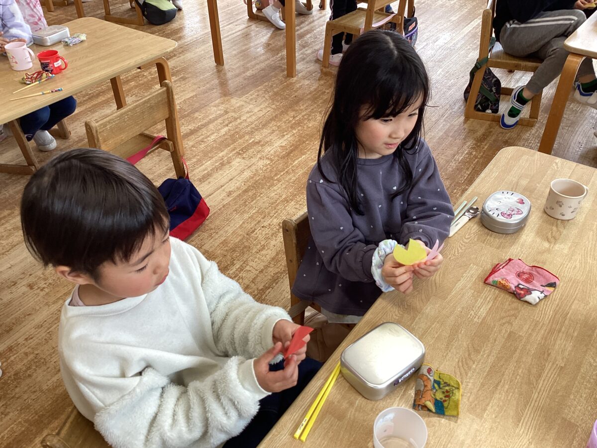 豆まきが終わった後は、各クラスにお福さんがやってきて、あたたかな春の訪れをお知らせしてくれました。本当の春はまだまだ先だけれど、綺麗な花びらをもらってほっこりしていた子どもたちです。