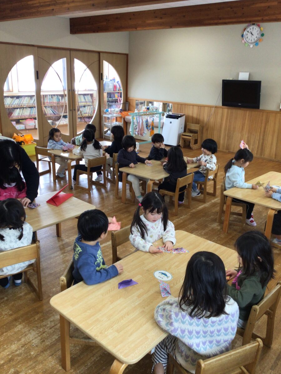 みんなで初めて折り紙に挑戦!折り方をじっくりみながら一生懸命折っていました。