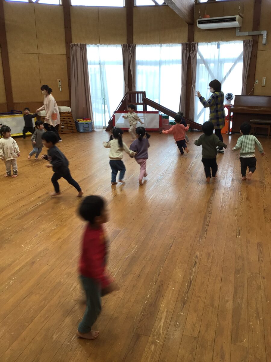 遊戯室で鬼ごっこを楽しみました!タッチされないように全力で走って、体も温まり、笑顔で楽しんでいましたよ😊