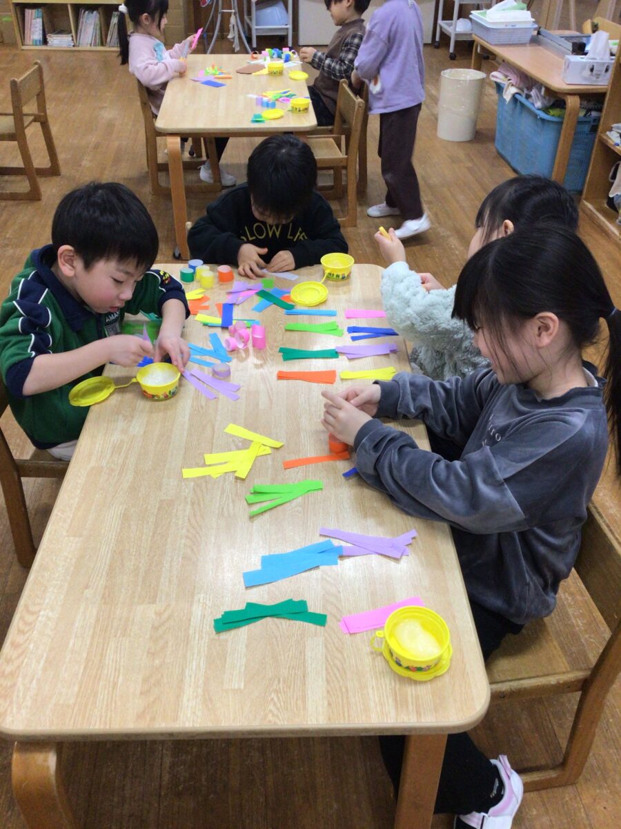 折り紙で輪つなぎを作ってオニの髪の毛も作りました。