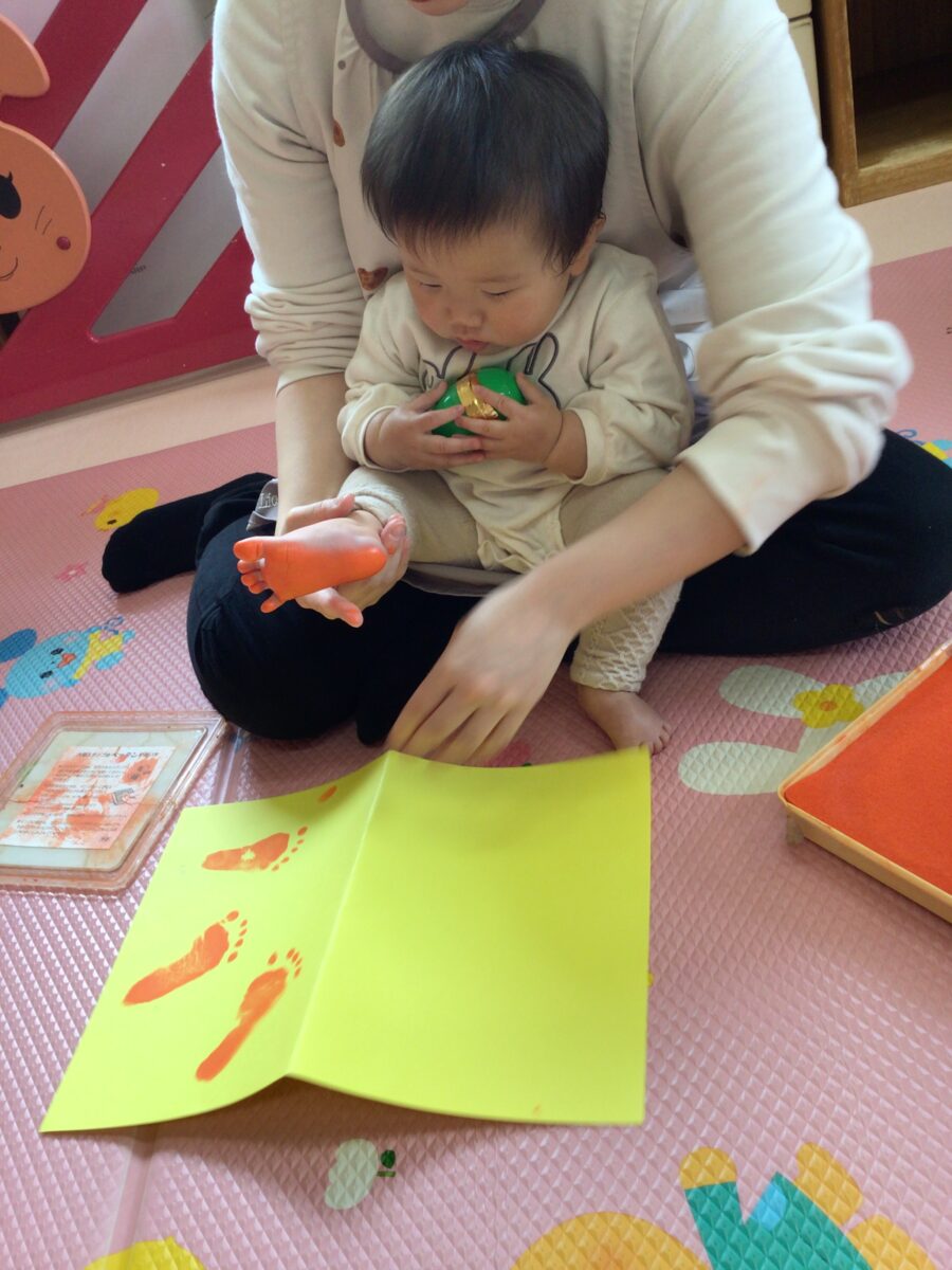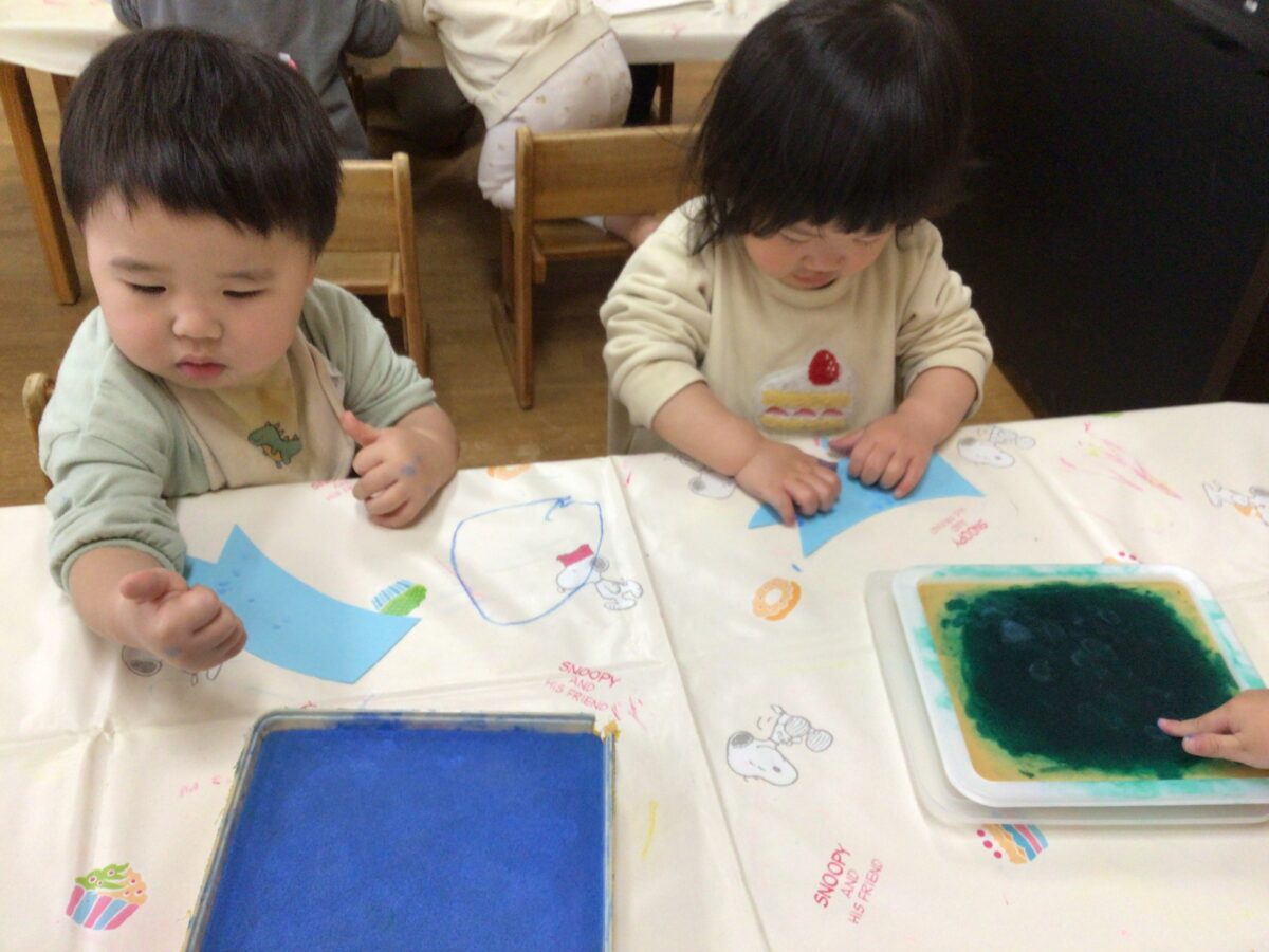 スタンプ台に指をつけて、「ペタ!」「ペッタン!」と夢中で模様をつけていました