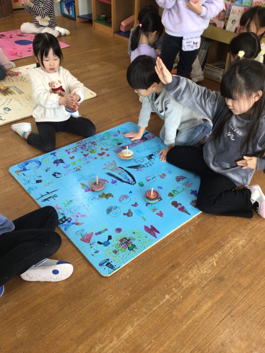 手回しコマはほとんどの子が上手に回し、お互いに「上手‼」「きれいに回っているね!」と