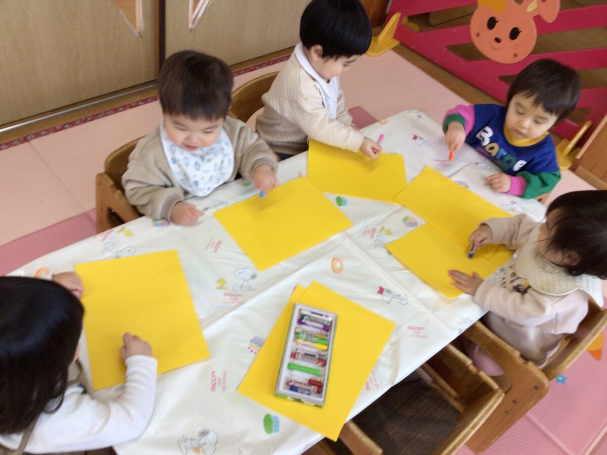 鬼のツノの部分になる黄色の画用紙にクレヨンで好きな線を描いて