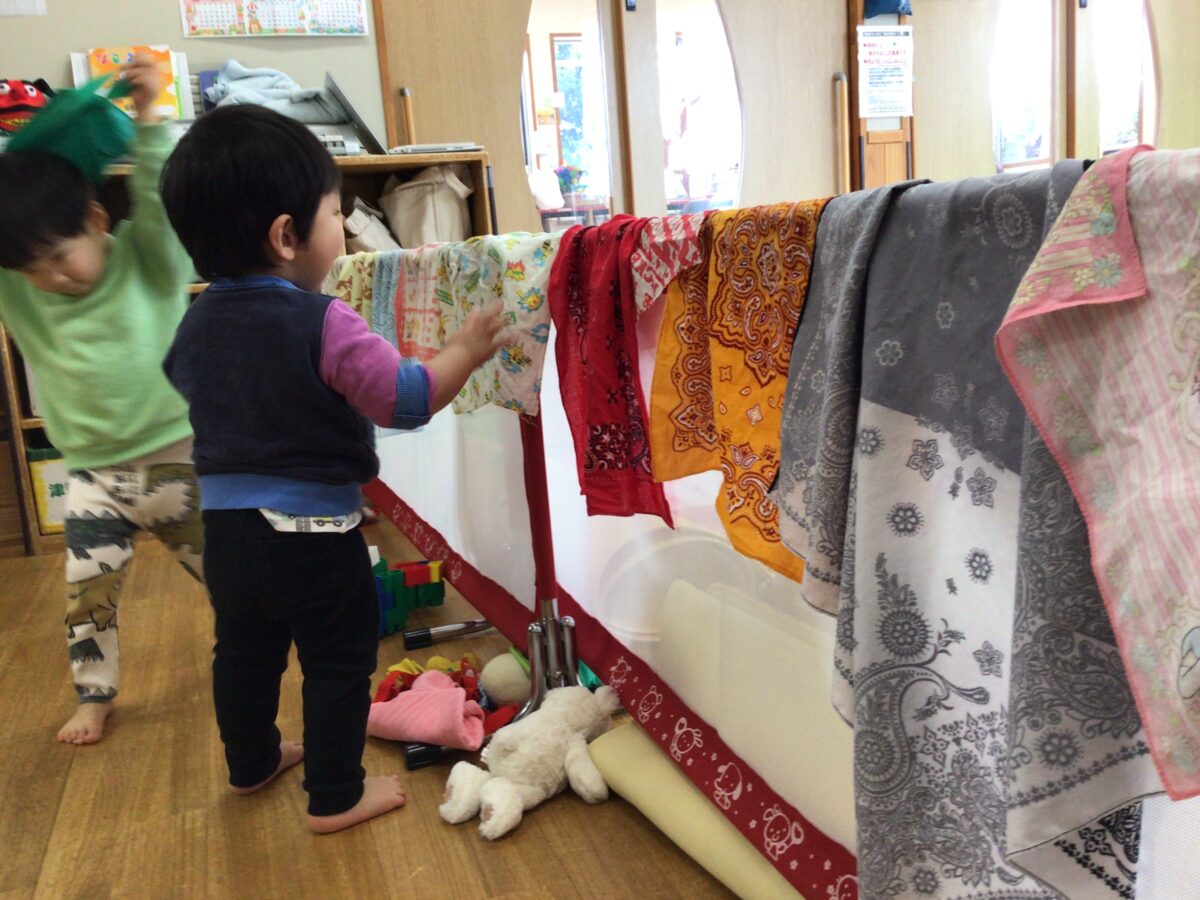 忙しそうにままごとのハンカチやバンダナをパーテーションにかけて