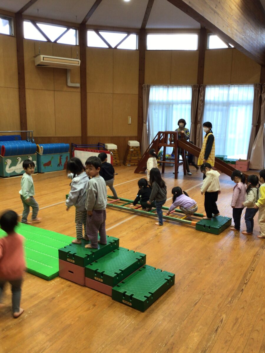 滑り台やはしご、そしてジャンプするための巧技台を準備をし、「どうぞ!」と掛け声をかけると・・